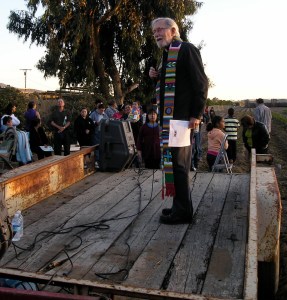 – Farmworkers, clergy and laity from different faiths speaking from the flatbed of an agricultural trailer/ tractor with the glow of sunset over the field behind them