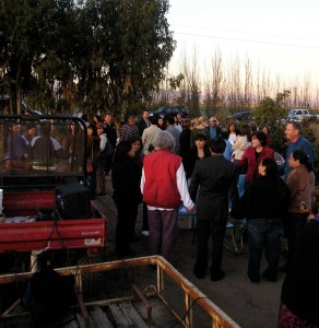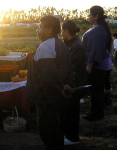 Since I didn’t blog last week, I thought I’d post a few pictures and highlights from an event this past Sunday that was hosted by Join the Farm! and the organizations that I work for in a side-internship, House Farm Workers (HFW), and Ventura County Clergy and Laity United for Economic Justice (VC CLUE). It was wonderful! About 125-150 farmworkers and other community members came out to the farm for an inter-faith Thanksgiving service out in our field. The purpose of the event was to give thanks for the land, the harvest, and the work of farmworkers in Ventura County, as well as to eat together as a community in a BIG OL’ potluck celebration. After the potluck in our backyard, we screened “A Home of Their Own,” a film from the perspective of the children of farmworkers on their experiences moving from sub-standard to affordable housing at Villa Cesar Chavez, a housing development (about 4 miles from our house) for farmworkers.